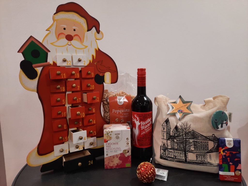 Außerdem gibt es in der Advents-und Weihnachtszeit unsere Ladentaschen, gefüllt mit verschiedenen Leckereien. Unter dem Motto „Ich schenk Dir was“ sind sie gut geeignet, anderen eine Freude zu bereiten. Kommt vorbei und schaut sie Euch an!